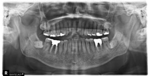 歯ぐきに隠れて目視できない歯槽骨の吸収状態、歯石が深く付着している場所、そして虫歯の有無を確認します。これにより、歯周病の**進行度(ステージ)**を正確に診断し、P②以降の治療戦略を立てるための必須情報となります。 実際のレントゲン写真です。※患者様の許可を得て記載しております