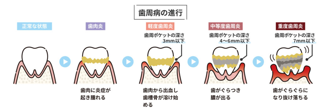 • 口臭がきつくなる: 歯周ポケット内で細菌が繁殖し、独特の嫌な臭いを発生させます。