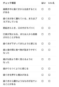まずは、鏡を見ながら、以下のチェックシートでご自身の歯ぐきと口腔内の状態をじっくりと確認してみましょう。当てはまる項目には「はい」をつけてください。